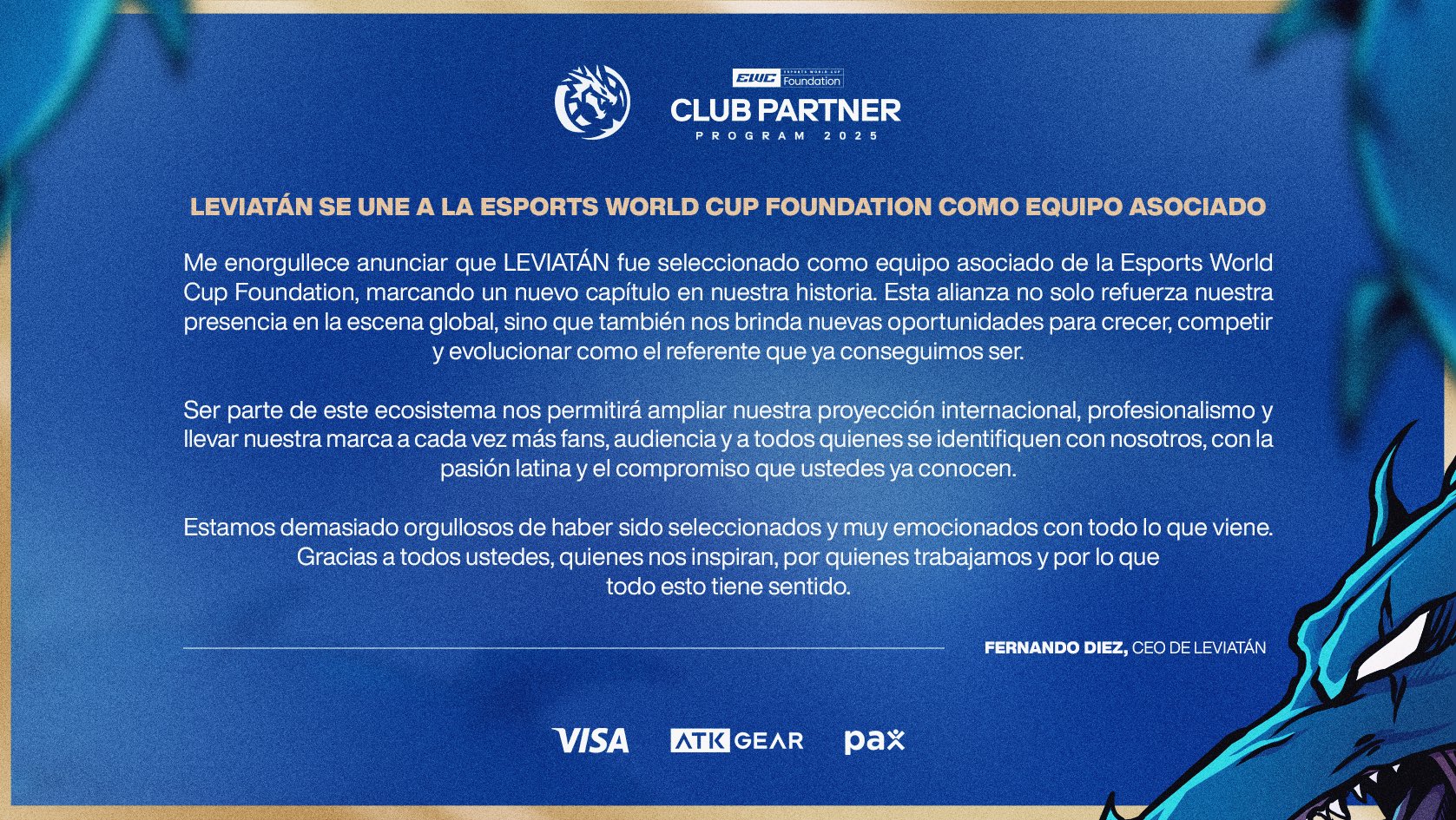 El director ejecutivo del club sudamericano, Fernando Diez, compartió el siguiente mensaje en sus redes sociales: "Me enorgullece anunciar que LEVIATÁN fue seleccionado como equipo asociado de la Esports World Cup Foundation, marcando un nuevo capítulo en nuestra historia. Esta alianza no solo refuerza nuestra presencia en la escena global, sino que también nos brinda nuevas oportunidades para crecer, competir y evolucionar como el referente que ya conseguimos ser."